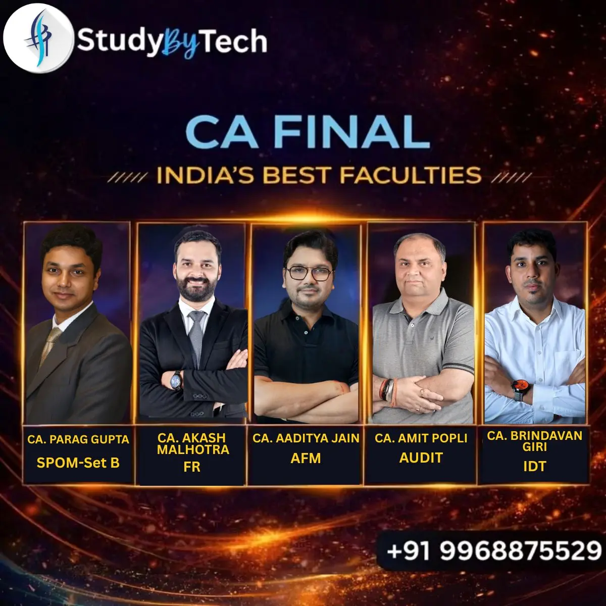| Faculties | SPOM-Set A- CA. Amit Popli sir SPOM-Set B- CA. Parag Gupta sir CA Final FR- CA. Akash Malhotra sir CA Final AFM- CA. Aditya Jain sir CA Final Advanced Auditing- CA. Amit Popli sir CA Final IDT- CA. Brindavan Giri sir |